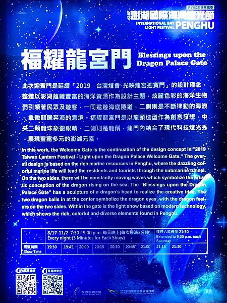 「福耀龍宮門」的展演時間是8/17-11/2,每天晚上的七點到九點之間,會有固定展出三分鐘的燈光秀: