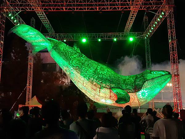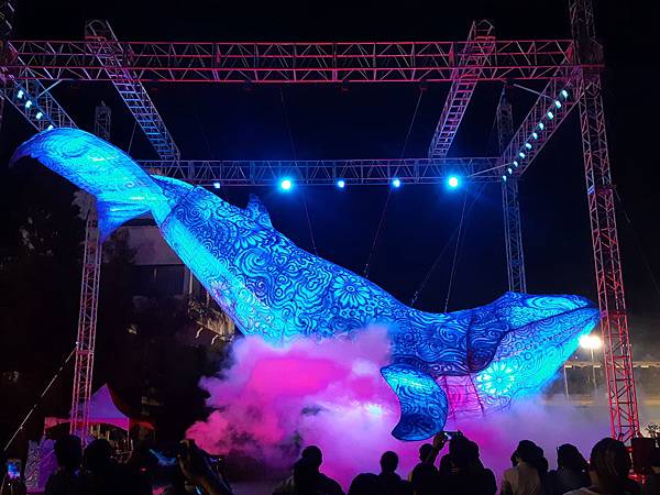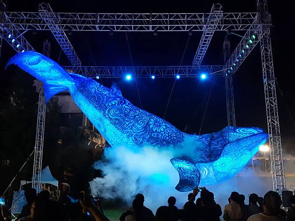 鯨動海灣在燈光秀時,鯨魚的翅鰭會擺動、嘴巴會張開、頭底跟底下都會噴煙,