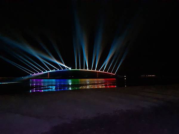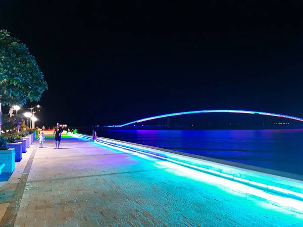 沿著海岸線的走道也打上了彩虹色燈光,跟遠處的彩虹橋相互輝映。